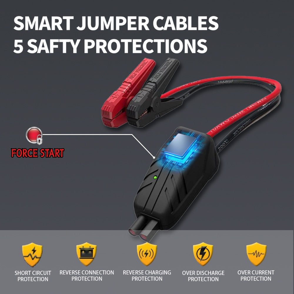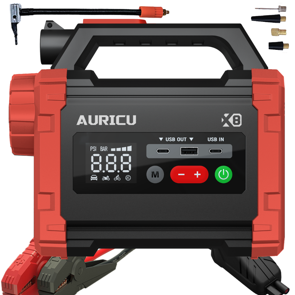 The Auricu X8 2400A Jump Starter is a high-performance battery booster designed for 8.0L gasoline and 6.0L diesel engines. It features a built-in 150 PSI air compressor and tire inflator, perfect for inflating tires and jumpstarting vehicles in emergencies. This portable jump box includes jumper cables and a portable charger, providing essential power and convenience on the go.