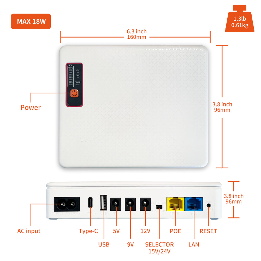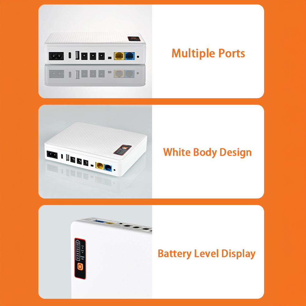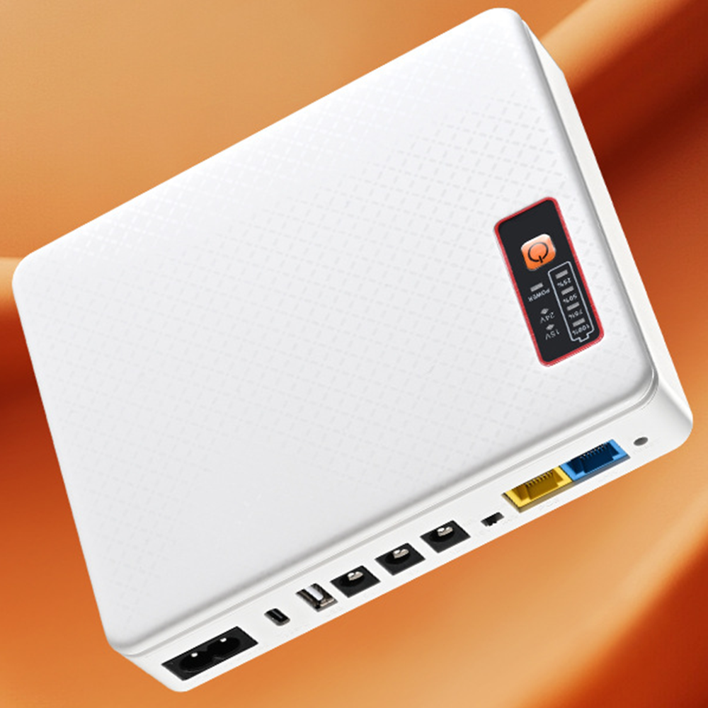 The Mini UPS is an integrated uninterruptible power supply designed to provide reliable emergency backup power during unexpected outages. With a built-in 12,000mAh rechargeable battery and a maximum output of 36W, it ensures essential devices such as routers, modems, IP security cameras, fingerprint scanners, switches, and LED light strips remain operational. The upgraded model supports both 15V and 24V Gigabit POE outputs, along with DC outputs (5V / 9V / 12V ⎓ 2A) and a USB 5V ⎓ 2A port, offering broad compatibility across various devices. Its RJ45 network port supports up to 100 Mbps, ensuring stable network performance even during power interruptions.